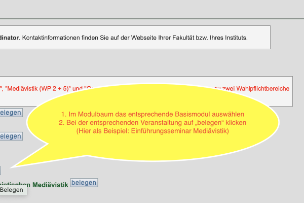 In den Basismodulen "belegen" Sie die Einführungsseminare und die Einführungsvorlesungen (vgl. das Beispiel in der übernächsten Lerneinheit). Auch für spätere Module gilt "belegt" werden alle Lehrveranstaltungen, die man besuchen möchte.