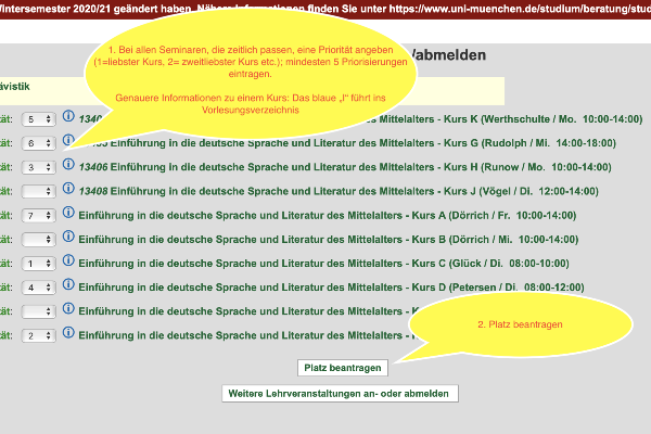 Sie sollten sich bei der Anmeldung zu einer Lehrveranstaltung innerhalb eines bestimmten Moduls unbedingt zugleich auch für die anderen noch angebotenen Lehrveranstaltungen im selben Modul unter Angabe entsprechender Prioritäten anmelden. Sollten Sie nämlich in der Lehrveranstaltung, für die Sie sich bevorzugt anmelden wollen und beispielsweise die Priorität 1 angegeben haben, keinen Platz erhalten, so werden Sie nach den von Ihnen angegebenen Prioritäten einer der anderen Lehrveranstaltungen im selben Modul zugewiesen. Wenn Sie hingegen keine Priorität bei der Kursanmeldung angeben und sich nur für eine Lehrveranstaltung innerhalb eines Moduls anmelden, kann es vorkommen, dass Sie zu keiner Lehrveranstaltung in dem betreffenden Modul zugelassen werden, falls Sie für die gewählte Lehrveranstaltung keinen Platz erhalten sollten. Wenn Sie für alle Lehrveranstaltungen in einem Modul bei der Anmeldung Prioritäten vergeben, sollte demzufolge der Fall, dass Sie für eine Lehrveranstaltung in einem bestimmten Modul überhaupt keinen Platz erhalten, nicht eintreten. Es kann allerdings sein, dass Sie mit der Teilnahme an einer Lehrveranstaltung mit niedrigerer Priorität vorliebnehmen müssen.