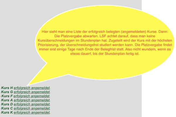 In der Regel wird Ihnen frühestens drei Tage und spätestens ca. eine Woche nach dem Ende einer Belegfrist im LSF-Stundenplan angezeigt, zu welchen Veranstaltungen sie zugelassen sind. Bitte sehen Sie vor Ablauf dieser Zeit von Rückfragen zum Stand der Belegungen ab!
